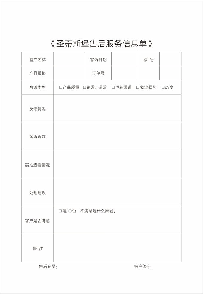 告别之前:告知客户圣蒂斯堡全国免费服务电话(售后服务贴)以及保修方式,请客户在《产品配送单》上签名,并填写《配送满意度调查表》后,合影留念。